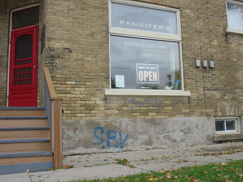 Steve down at the Sebringville Garden Centre told us that, because it's to stay on the sidewalk, we needed to get some weight in the bottom. If we were putting it on our deck, we would have wanted to keep it as light as possible, but the sidewalk(and possible damage from passersby) required a fair bit of weight. So in went a bunch of stuff I wasn't really looking forward to paying to take to the dump (nothing noxious, just heavy). Then we put in some topsoil and finally the nice potting soil we'd bought from Steve. The two Virginia Creeper plants seem very happy there and have almost filled the pot and started climbing up the bricks already.