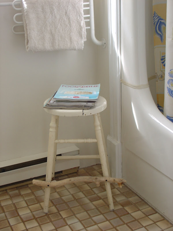 It's just an old stool I picked up at the auction for pennies. At the time, it had a nasty, flouncy cover on the seat and was missing its bottom rung. Eventually, it would have fallen apart.