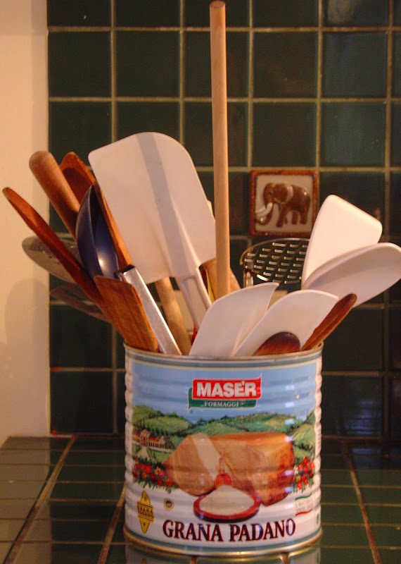 My husband's a baker. One of the breads he makes is a roasted garlic and parmesan. The parmesan used to come in these big tins. We needed something that was big enough to store all our wooden spoons and tongs beside the stove. (And, yes, we use all of these.) It seemed silly to go out and buy something when this was available and I liked the graphics, so....