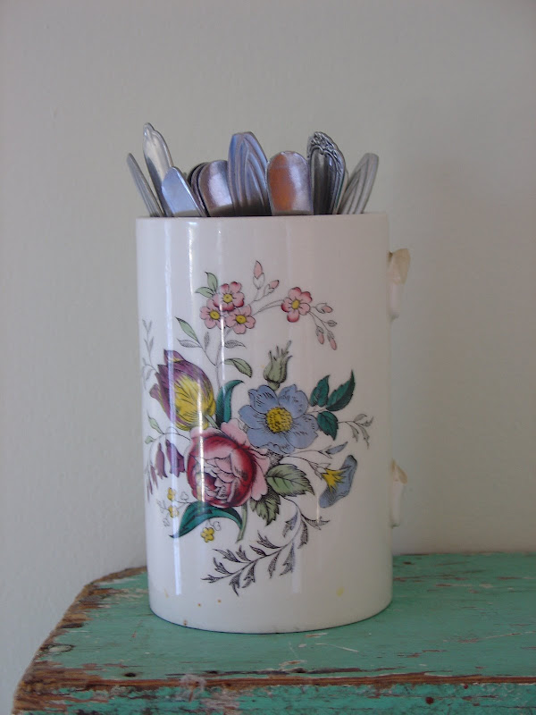 This is the mug I drank my tea out of for many years. It helped to get me ready to face many a day of renovating. But then one day the handle broke off and couldn't be repaired. It was too pretty to discard, so I pressed it into service as a spoon mug. (This seems to be an English tradition. It's as if tea-making is such a pressing concern that keeping the tea spoons with the other cutlery would slow down the process just TOO MUCH, so the spoons are kept in a mug, right next to the kettle.)