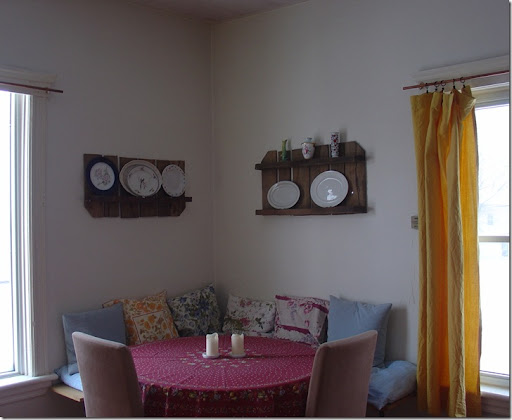 We had some old palettes in the basement. The constraints were that the plate racks be high enough that people could sit on the banquette without whacking their heads. But, they couldn't be so high that Alan couldn't reach the platters.